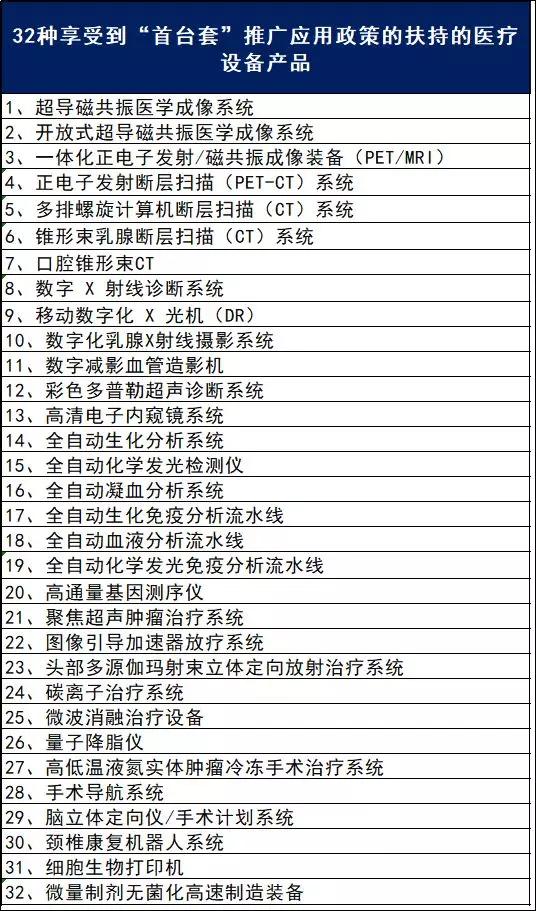 依據工信部最新發布的2017年版《首臺(套)重大技術裝備推廣應用指導目錄》,共有32種醫療設備產品可以享受到“首臺套”推廣應用政策的扶持。