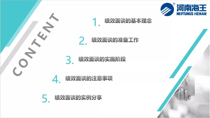 隨后,她從績效面談的基本理念、績效面談的準備工作、績效面談的實施階段、績效面談的注意事項、績效面談的實例分享等五個方面進行講授。